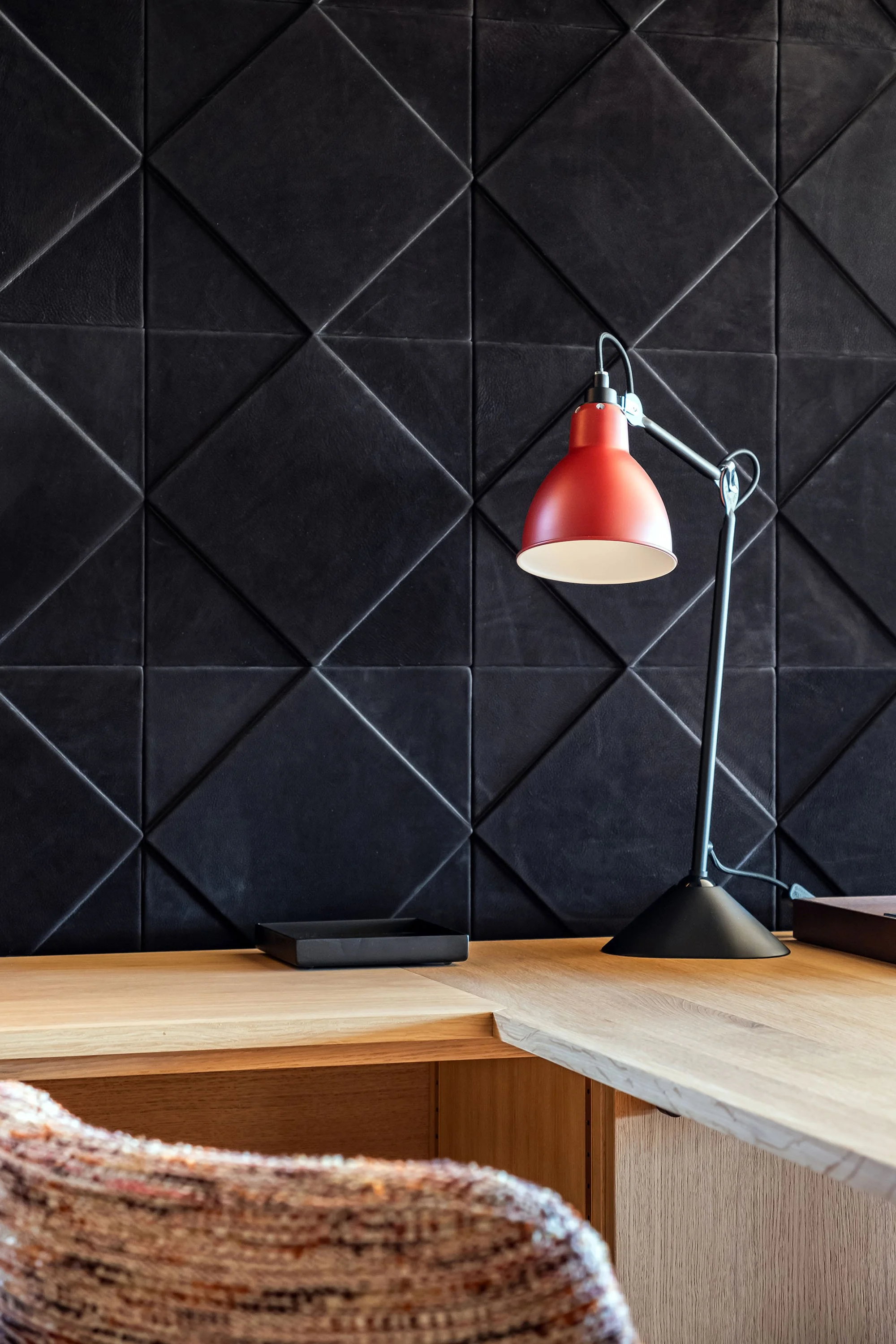 La lumière a été utilisée pour souligner les textures – cuir, bois, acier perforé – et révéler la précision des lignes de la bibliothèque et du bureau. J’ai également mis en avant la dimension architecturale de l’espace : la cage d’escalier et son papier-peint graphique, ainsi que les suspensions dorées qui apportent un éclat singulier dans l’obscurité volontaire de la pièce.