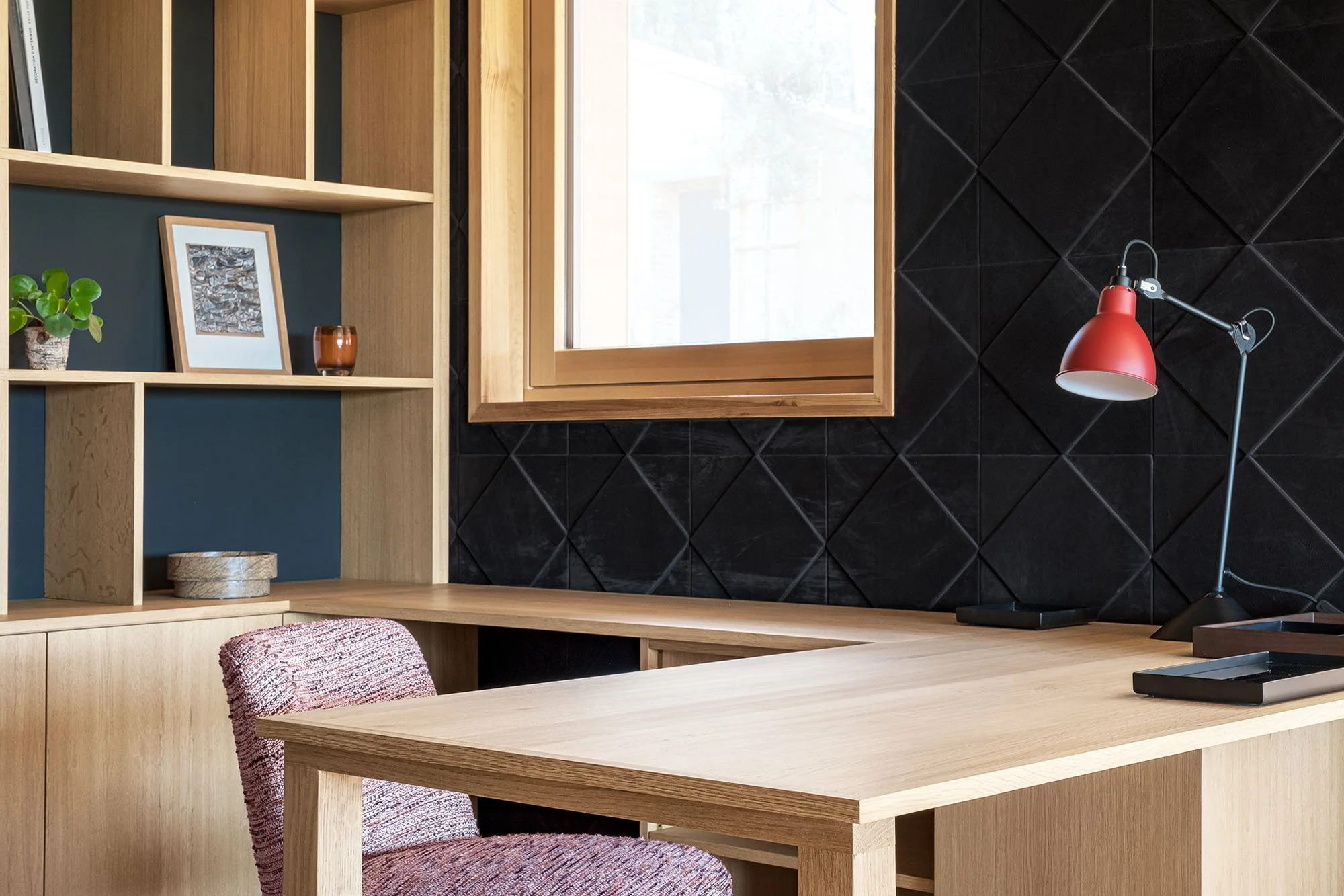 Pour ce reportage, j’ai cherché à traduire l’atmosphère feutrée et contemporaine voulue par la décoratrice Virginie Vaudenay. Le travail photographique s’est concentré sur le contraste entre l’intensité des murs et du plafond noir et la chaleur du chêne naturel des aménagements sur mesure.