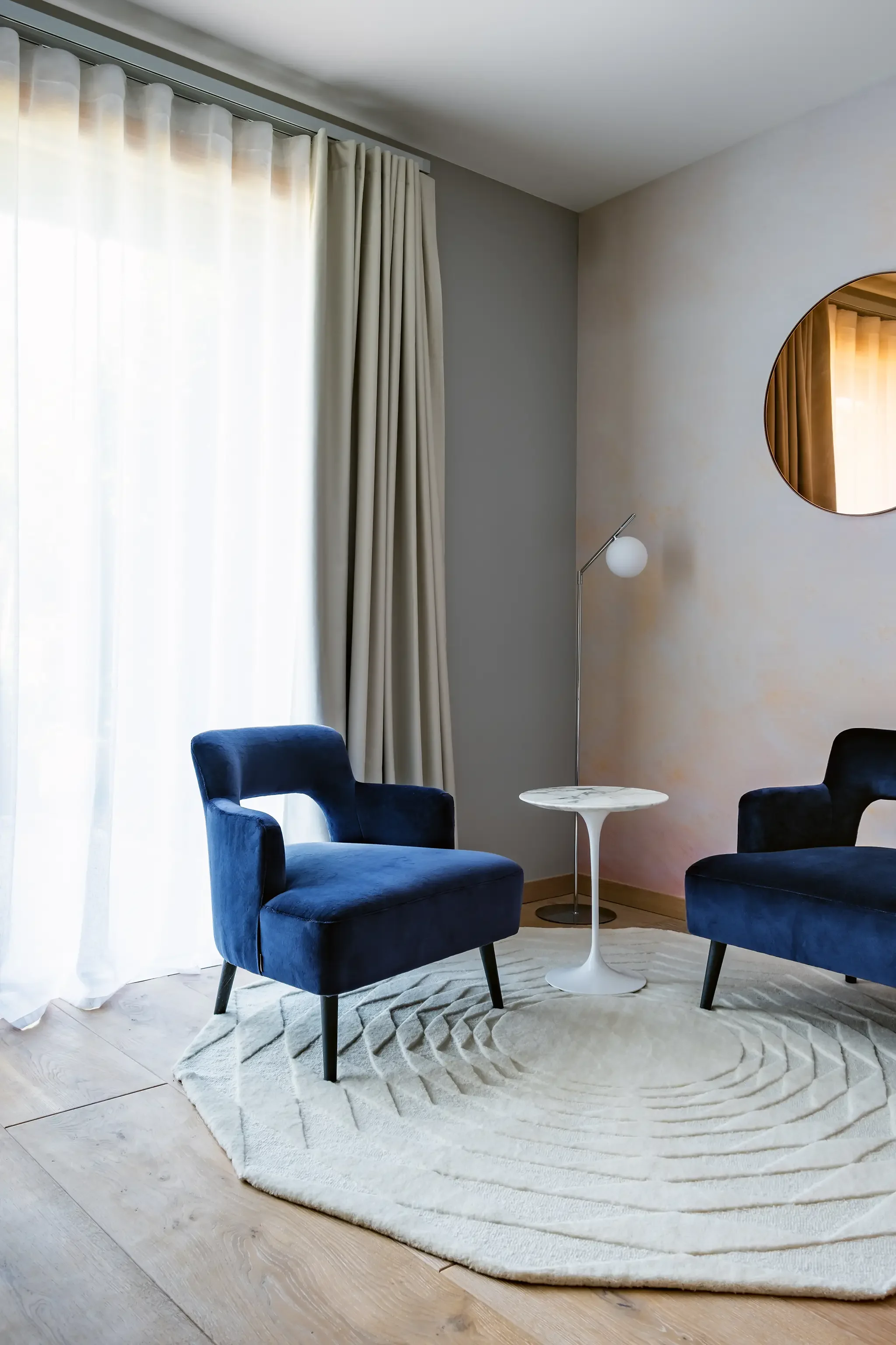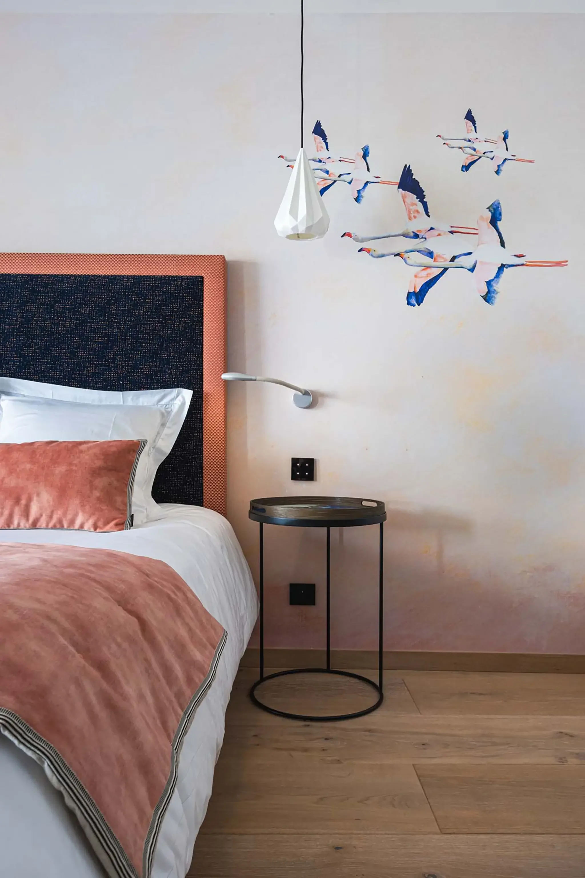 Le bleu marine et le corail dominent la composition, guidés par le papier-peint panoramique aux flamants roses qui donne son identité à la pièce. Les images mettent en avant la profondeur des textures – cuir, velours, marbre, laine – en révélant leur contraste avec la lumière naturelle.